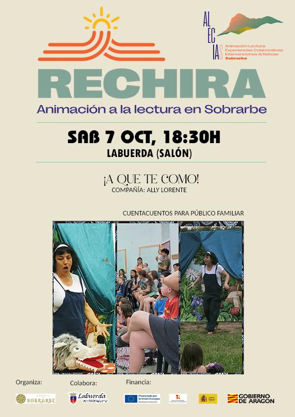 ¡ A QUE TE COMO ! Whatsapp: ¡ A QUE TE COMO ! Fecha 04 octubre 2023 Sábado 7 de octubre 18:30 h - Plaza Mayor de Labuerda Cuenta cuentos para público familiar de la mano de Ally Lorente, dentro del programa RECHIRA Galería imágenes