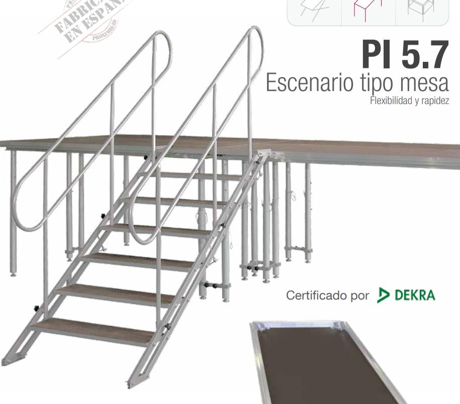 Con un presupuesto de 9.784,60 €, el escenario se divide en módulos de 2 x 1 m y se consigue una superficie de hasta 48 m2, regulable en altura, se acompaña con unas escaleras de acceso al mismo y barandillas.
