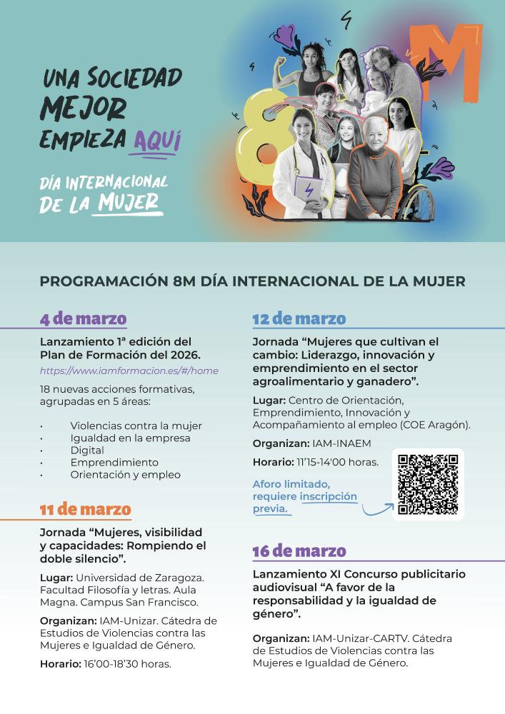 Desde el Instituto Aragonés de la Mujer y con motivo de la celebración del Día Internacional de la Mujer, 8 de marzo, queremos reafirmar el compromiso que debe estar presente en cada decisión pública y en cada espacio social bajo el lema “Una sociedad mejor empieza aquí”. Se quiere destacar que el cambio nace de lo cercano, desde la educación y el empleo, desde las instituciones y las empresas, desde el deporte, la ciencia y los hogares.