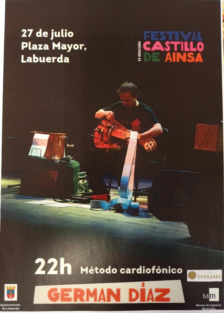 GERMÁN DÍAZ, Método cardiofónico. 27 julio Plaza Mayor de Labuerda, 22:00 h Whatsapp: GERMÁN DÍAZ, Método cardiofónico. 27 julio Plaza Mayor de Labuerda, 22:00 h Fecha 25 julio 2023 Espectáculo musical basado en los ritmos de los latidos del corazón que el doctor Iriarte grabó en los años cuarenta y editó en placas de pizarra con el nombre de «Método Cardiofónico». 27 de julio a las 22:00 h en la Plaza Mayor de Labuerda Galería imágenes